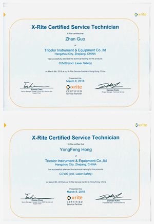 培训结束,杭州三锦两名工程师都取得了Ci7x00系列分光仪的技术服务认证书,今后可以更好的为使用爱色丽分光仪的客户做好售后维修和校验服务。